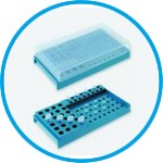 Fully autoclavable. This storage/working rack, with lid, is designed to work with different PCR volumes at the same time. It can accommodate up to 32 individual 0.2 ml PCR tubes, 24 pieces of 1.5/2.0 ml and 16 pieces of 0.5 ml microtubes. Tube wells are alpha-numerically matrixed with raised bold type for accurate sample identification. The rack also has a transparent lid for easy viewing of samples. Frosted writing panels on four sides allow labelling or writing.